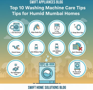 Discover essential washing machine maintenance tips for Mumbai's humid climate to prevent mold, odors, and breakdowns. From vinegar cleans to dehumidifiers, keep your washer fresh. Swift Appliances offers expert service in Mumbai and Thane.